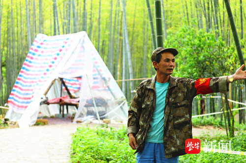 “护笋点”系用竹子搭建的苟简帐篷,一层透明的厚塑料布当“屋顶”,内部是两张木棍搭的通俗床,白昼棚里温度很高,用电、用水很清贫。护笋队员陈师父提着一壶水,跑去竹海湖隔邻的工地烧水。每天,洗头洗脸洗脚全用一个盆。