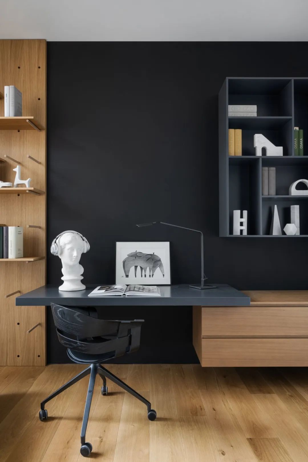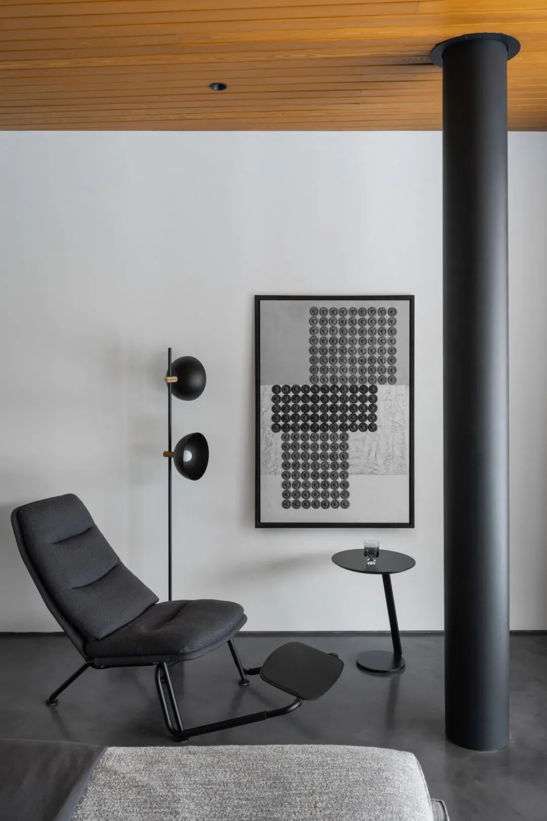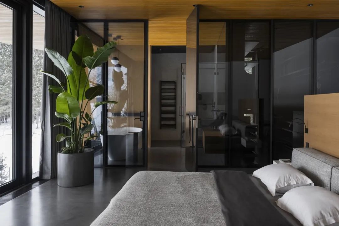 ▎烟囱管穿过二楼的主卧室,特意留出可见部分,以与房间的好意思感相调和。为了搭配深色色彩,Architecture Bureau 8088 添加了其他深色荫庇,举例躺椅、艺术品以及衣柜和浴室之间的玻璃阻遏。