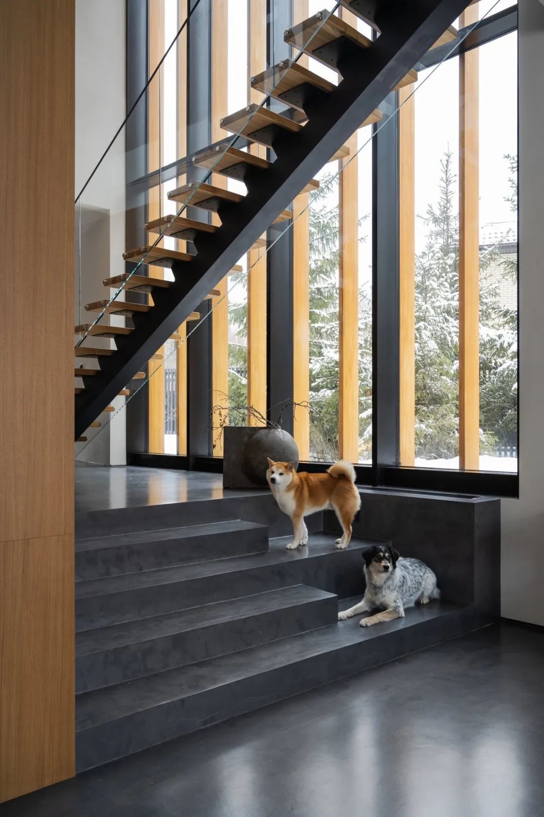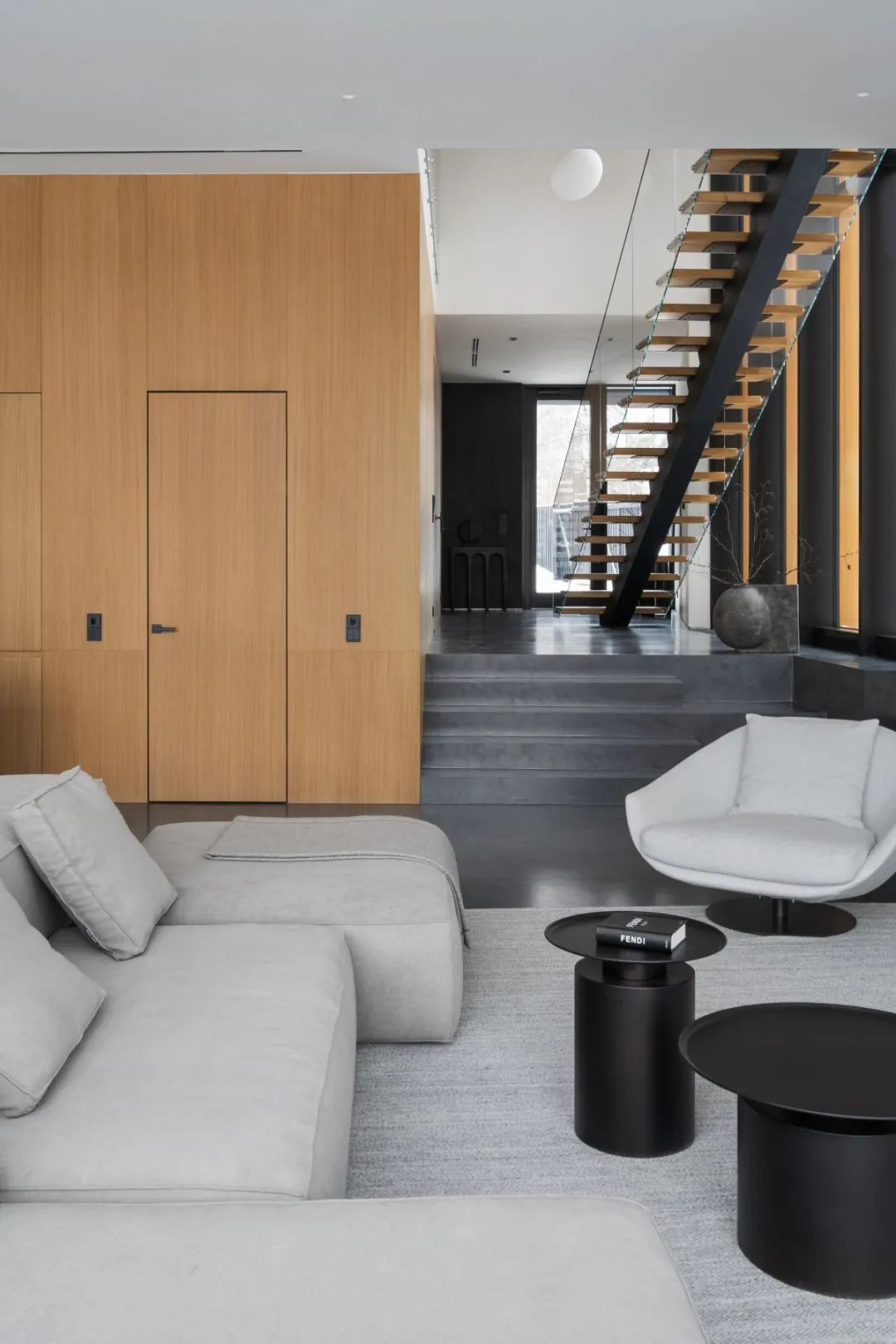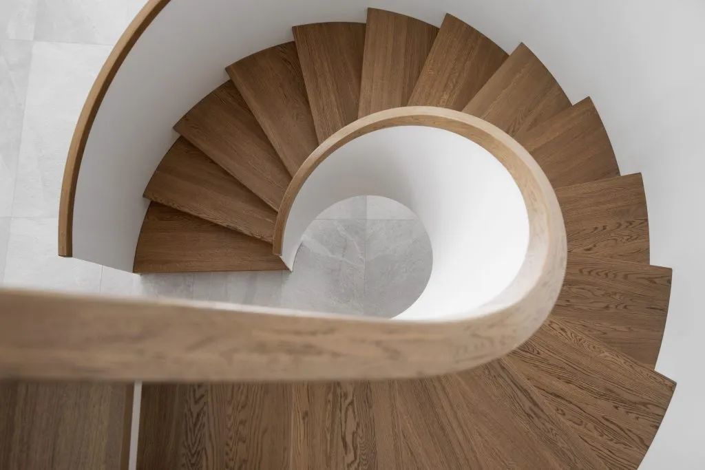 ▎螺旋楼梯成为空间的主要身分,当然明后干预走廊并组织明晰的分区,玻璃滑动隔板将走廊区域与客厅和厨房分手开。从大厅的空间穿过厨房,景点和露台的风景开放,坐在客厅的沙发上,不错赏玩室外的好意思景。