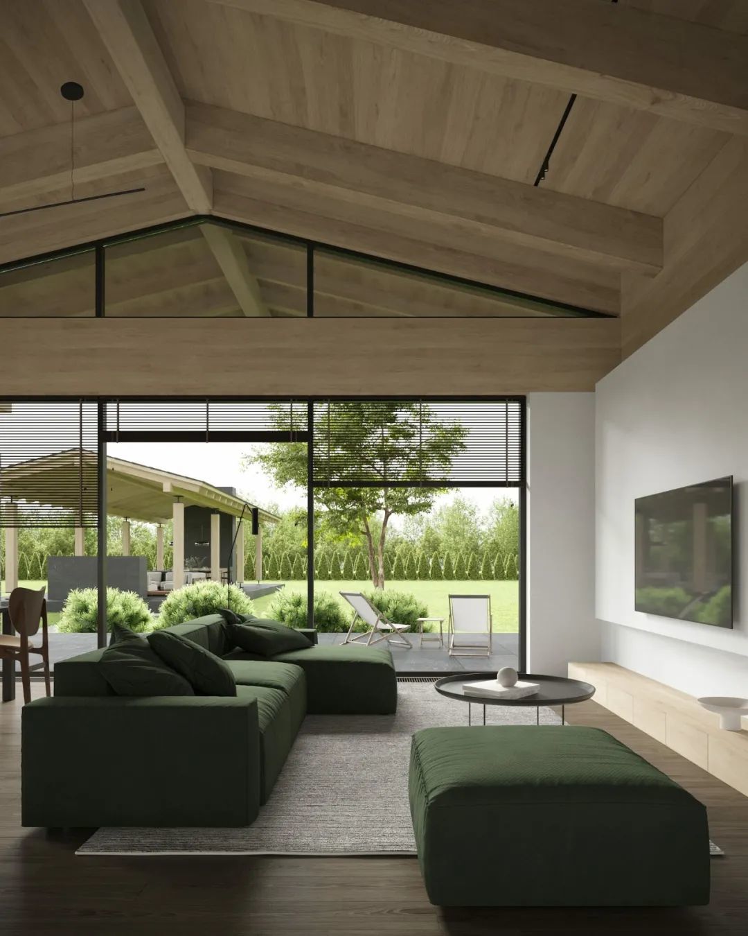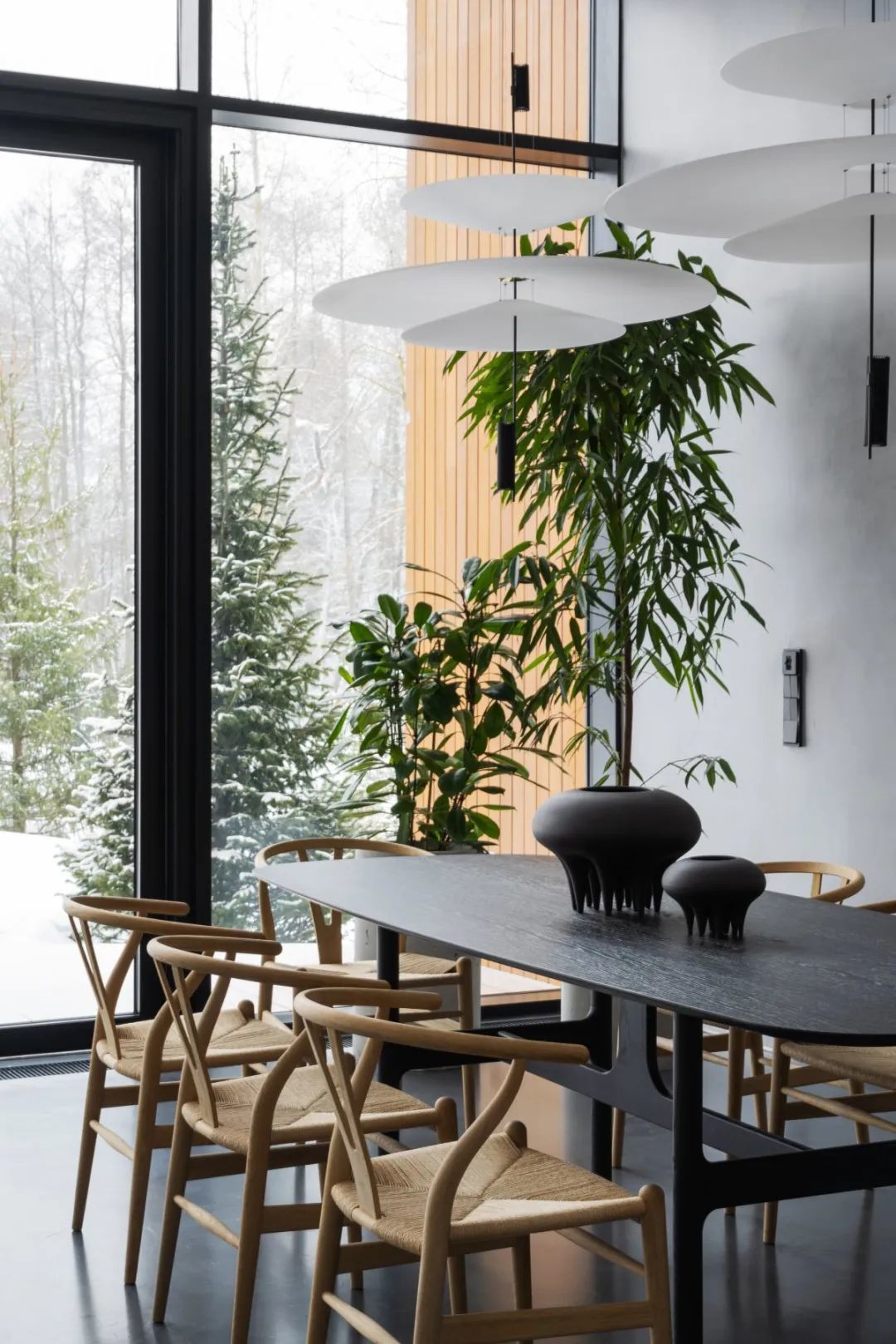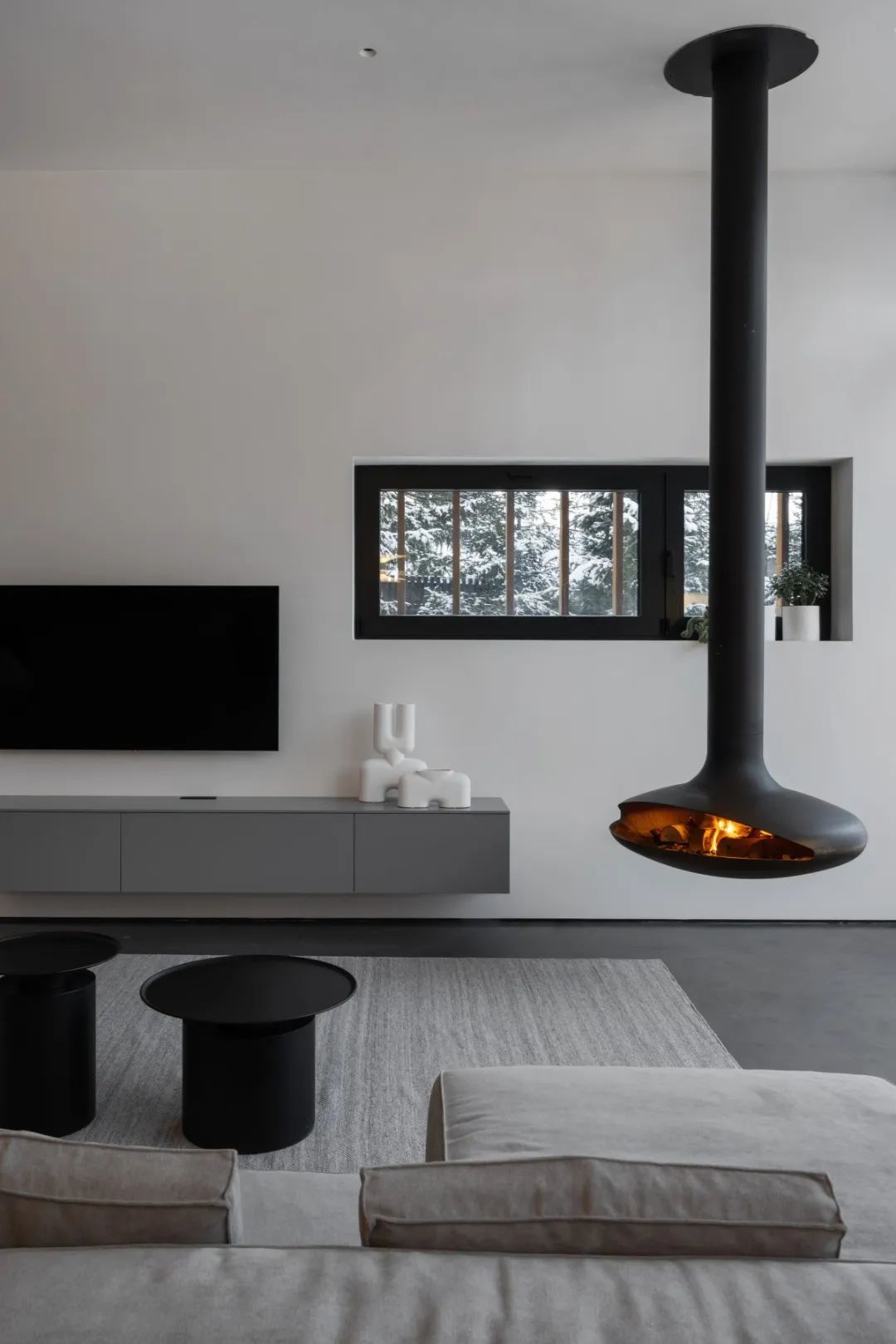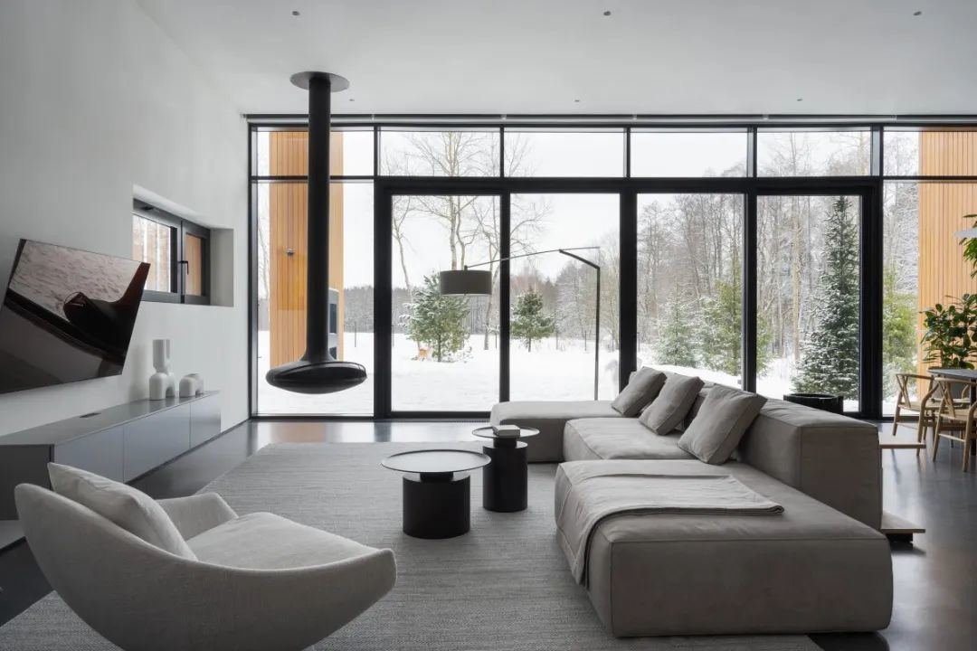 ▎起居用餐区的全景窗户可赏玩到丛林的好意思景。房东的一个要紧条目是壁炉,因此Architecture Bureau 8088联想了两个壁炉:一个是建在露台顶棚上的室外壁炉,另一个是客厅中吊挂的室内壁炉,它“飘摇”在空中,不会遮挡露台和庭院的风景。